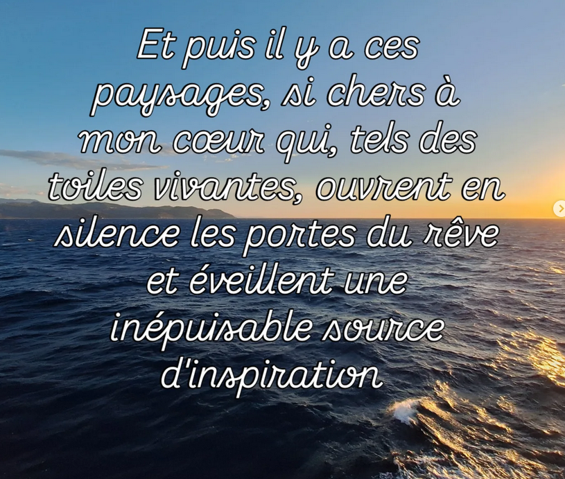 Inspirée par des paysages, l'étendue de la mer au couché du soleil, les montagnes enneigées, par des moments d'amour et d'amitié, par des hommes et des femmes chers à mon cœur, par des moments de douceurs en compagnie de mes animaux, par des mots, des histoires, des rêves, par l'odeur d'un feu de cheminée ou d'une plage après une journée trop chaude, inspirée par l'espoir et la reconnaissance.